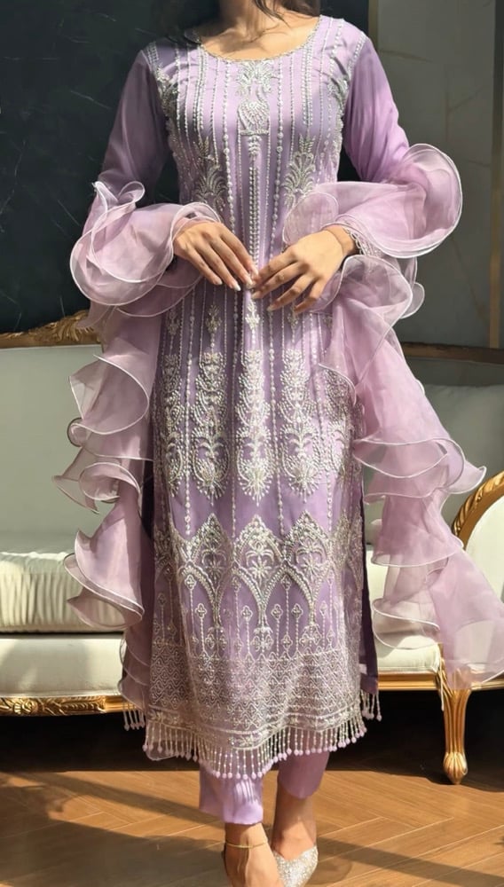 *Heavily embroidered Cutdana Net shirt embellished with pearl hangings on border and detailing on sleeves and neckline.
