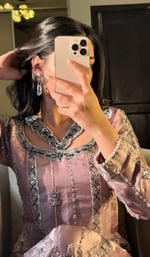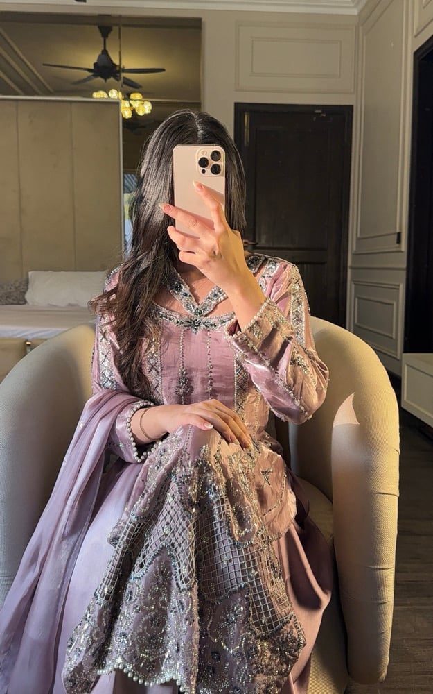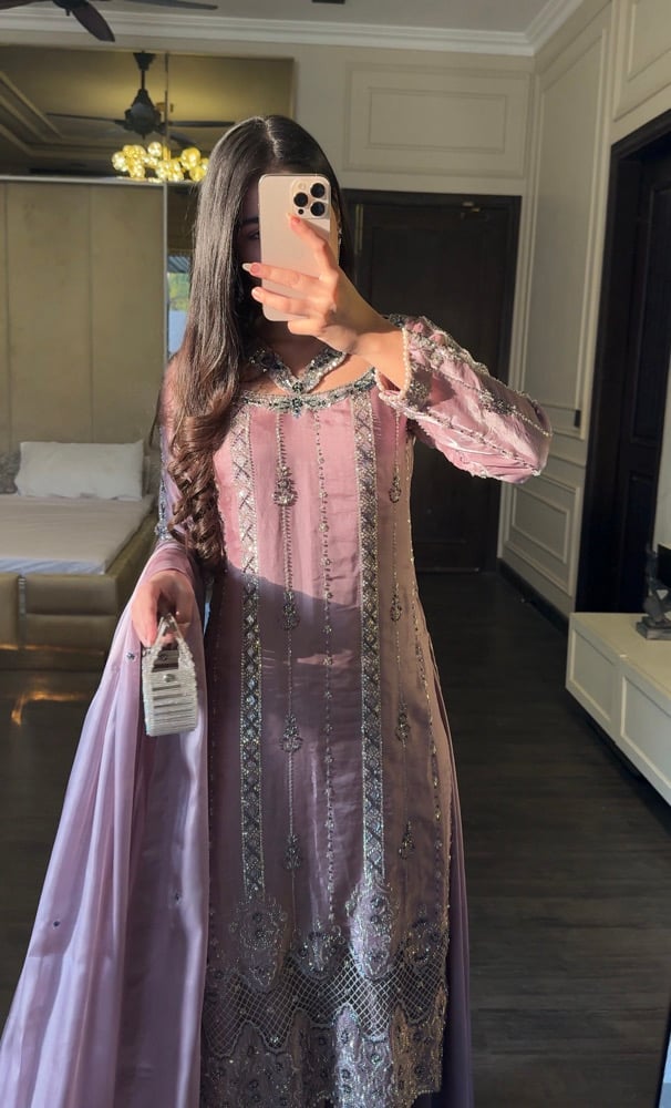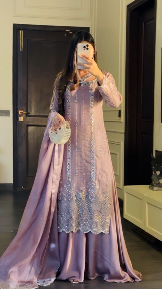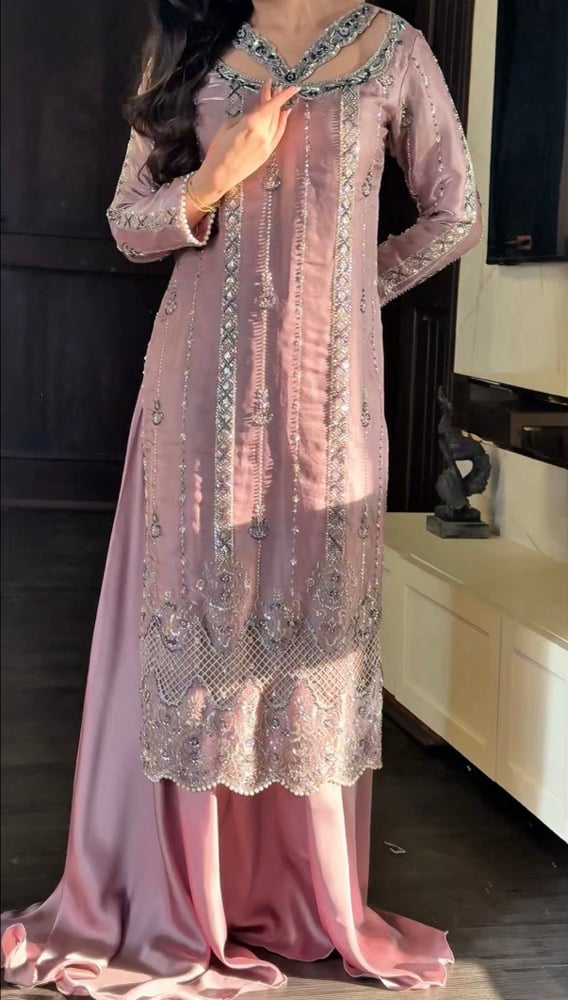 *Heavily embroidered Cutdana seesha silk shirt embellished with pearl hangings on border, sleeves and ada work embroidery on neckline.